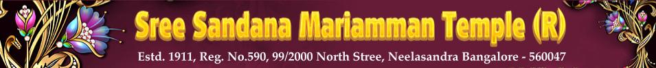 home     -     history    -   events    -    photos    -    videos   -   contact us Sree Sandana Mariamman Temple  is situated in Neelasandra, North Street, Bangalore,  this temple was built by the devotes and the well-  wishers in the year 1911, this is one of the oldest  temple in the locality and the temple is celebrating  100 years.